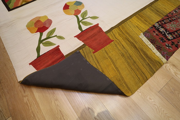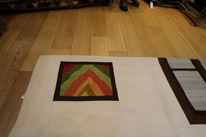Kilim Patchworks Rugs are created from pieces of miscellaneous 40 – 80 years old hand-woven weavings. A new generation of artists in Istanbul utilize these semi-antique weavings after they have them cleaned and some of them dyed to their specifications to create a new art form. The weavings are cut into squares and other basic geometric forms and assembled in a pattern, backed with two layers of fabric to reinforce, sewn together and ironed.
