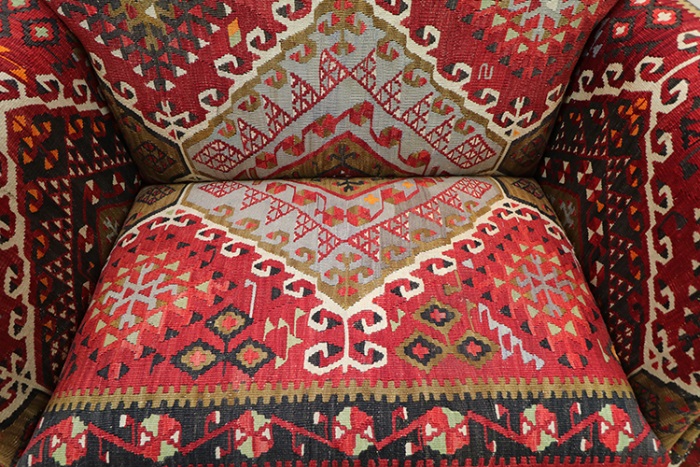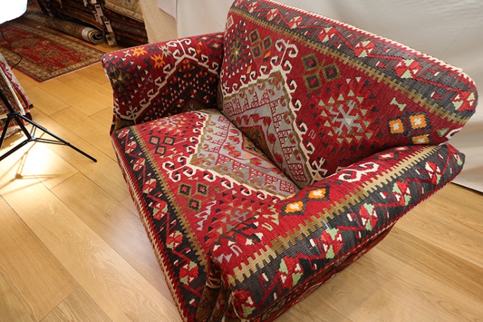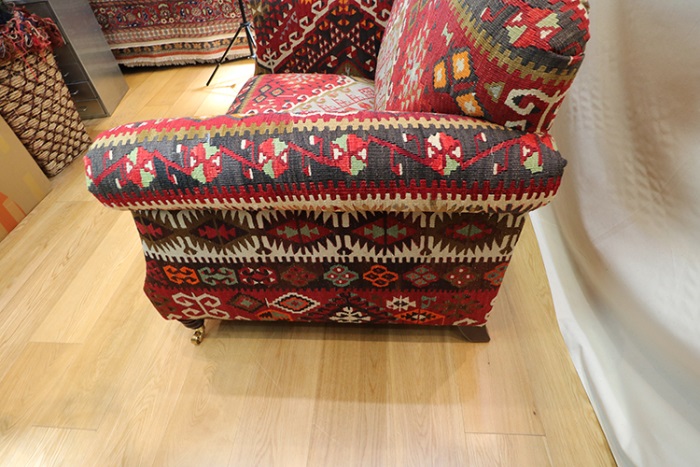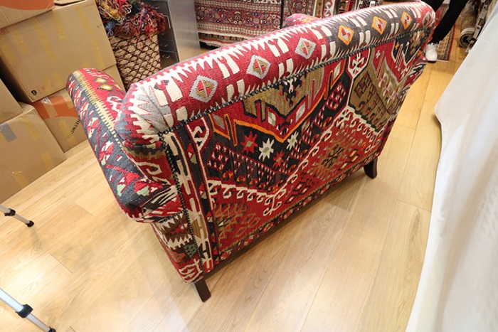 Since every kilim is unique, the colouring and motifs will vary from each piece of furniture. Kilim Stools, Kilim Sofas and Kilim Chairs can be made to order for any size, we manufacture upholstered furniture using old Turkish kilims and fabrics. As well as ready stock of sofas, armchairs, ottomans and foot stools we carry a large selection of kilims which you can choose to be upholstered in our product range. We can custom make Kilim furniture suitable for your requirements Overall Width: 53 inch Overall depth back to front: 36 inch Overall height: 36 inch Seat Height: 17 inch Inside arm to arm seat width: 38 inch