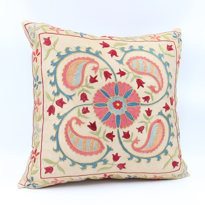 Silk Suzani Cushion Cover, Stunning cushion covers from Uzbekistan. Hand embroidered in pure silk thread. Durable and stylish, they will brighten up your room in a jiffy! Perfect for a splash of colour on your sofa or chair. Back side is cotton fabric with hidden zipper.