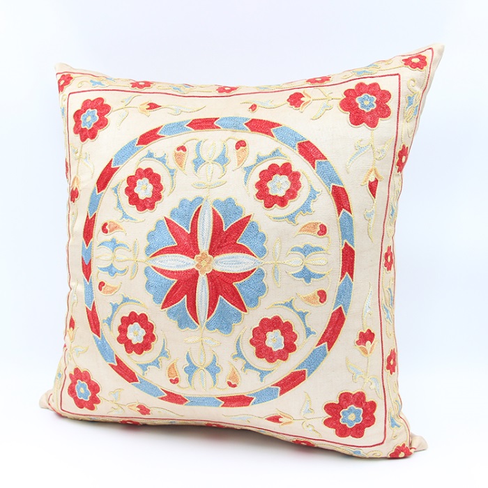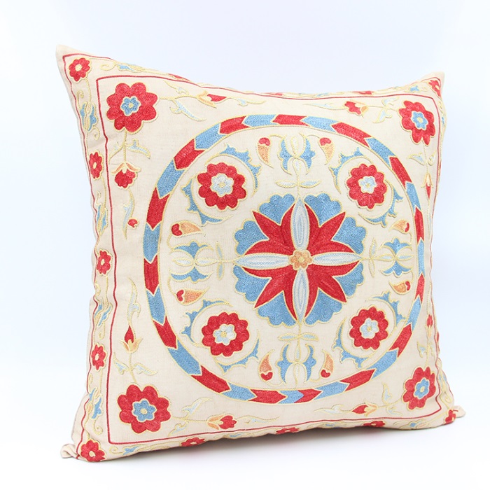 Silk Suzani Cushion Cover, Stunning cushion covers from Uzbekistan. Hand embroidered in pure silk thread. Durable and stylish, they will brighten up your room in a jiffy! Perfect for a splash of colour on your sofa or chair. Back side is cotton fabric with hidden zipper.