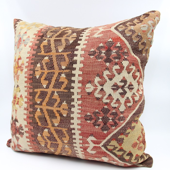 Kilims used in our products are old and genuine. These Kilim Cushions are made with pieces of carpets and kilims joined to make Kilim Cushion Covers. Kilim Pillows can be made for order for any size. Back has cotton with a zipper.